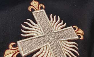 Traditioneller Musketier-Umhang mit Metallumwickelten Garn mit Normal- und 3D Stick und Emblemstickerei.